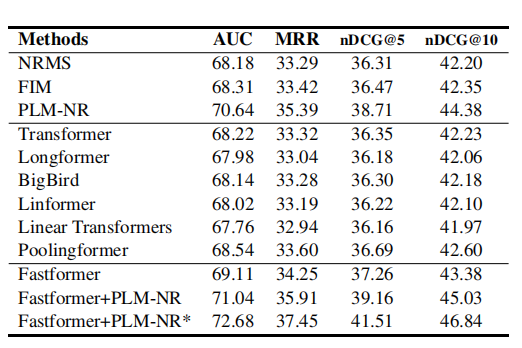 上表比较了不同方法在新闻推荐任务中的性能。我们可以看到,在不同的Transformer架构中,Fastformer取得了最好的性能。