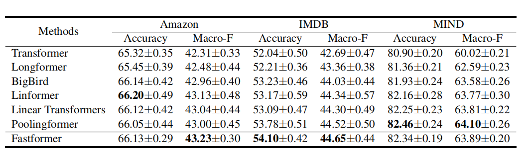 上表比较了Fastformer和一些针对Transformer改进方法在三个分类数据集上的性能。根据结果,我们发现高效的Transformer变体通常优于标准的Transformer模型。在长文本和短文本建模中,Fastformer可以实现比其他高效Transformer变体具有竞争力或更好的性能。