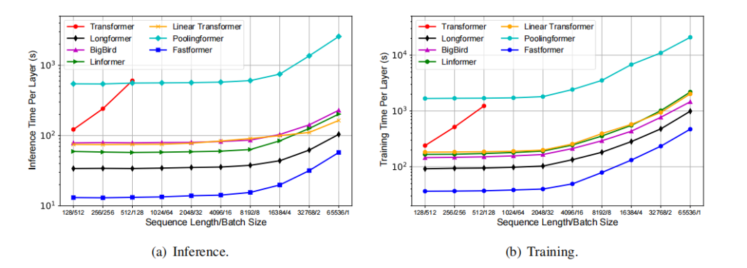 从上图中,我们可以看到当序列长度相对较长时,Transformer效率低下。在训练和推理时间方面,Fastformer比其他线性复杂度Transformer效率要高得多。