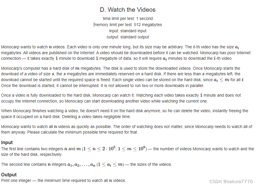 Monocarp 想看 n 部影片,第 i 部影片的大小为 ai MB,现在 Monocarp 有一个内存为 m MB 的硬盘,他的网速允许每分钟下载 1 MB 的内容。Monocarp同一时间只能下载一部影片,并且该影片的大小不应大于硬盘的剩余空间。开始下载一部大小为 s MB 的影片时,将立即占用硬盘 s MB 的空间。Monocarp 可以在下载影片的同时观看已经下载好的影片,所有影片的时长都是1分钟。观看结束后,他会删除掉看过的影片以腾出空间。在上述规则下,问 Monocarp 看完所有影片最少需要多少分钟。