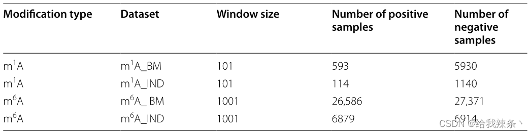 我们提取了两种常见类型的单核苷酸分辨率的人类RNA修饰位点数据集,包括m1A和m6A。对于m1A和m6A站点,本文的数据集分别来源于Chen等人[12]和Zou等人[30]的前期研究。唯一不同的是在m6A站点上使用了Zou验证集作为本文的独立测试集。