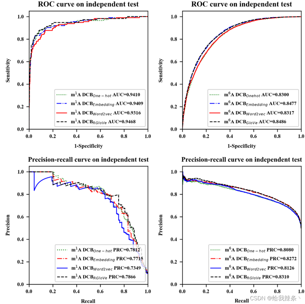 第三,基于上述自建的DCB模型,比较了RGloVe、RNA词嵌入、One-hot编码和word2vec的预测性能。结果表明,我们的RGloVe在预测性能上优于其他三种编码方案。这一发现与Pennington, J(2014)提出的GloVe比word2vec具有更高的语义准确率是一致的。