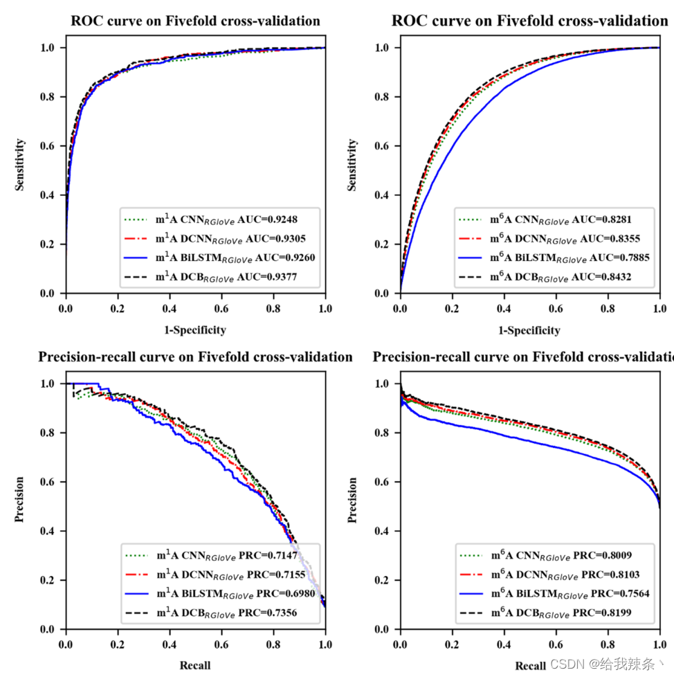 此外,本研究还比较了DCBRGloVe和DCNNRGloVe的性能。在m1A和m6A上,DCBRGloVe的AUROC分别比DCNNRGloVe高0.72%和0.77%,在m1A和m6A上,DCBRGloVe的AUPRC分别比DCNNRGloVe高2.01%和0.96%。原因可能是DCNN没有记忆功能,不能学习顺序相关性。相反,DCB可以根据DCNN捕捉不同空间结构的局部相关性,并根据BiLSTM有效地学习文本中每个k-mer的上下文。综上所述,DCB方法比其他方法更能准确地理解序列语义。