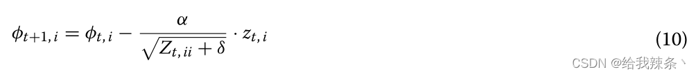 其中α表示学习率,Zt, ii∈Rd×d是一个对角矩阵,其中每个对角元素i, i是梯度的平方和。φt, I到时间步长t, δ一般为1 e−8。