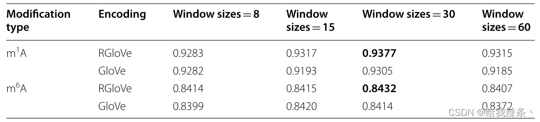 首先,本研究比较了基于RGloVe和GloVe编码方法在4种不同滑动窗口大小(8、15、30和60)下对m1A和m6A甲基化位点的预测性能。评估结果表明,使用RMSProp代替Adagrad来最小化全局向量模型的损失函数,确实可以更有效地训练模型。这一结果与Ruder, S.(2017)的结果一致,Ruder, S.(2017)指出RMSProp可以克服Adagrad的弱点。当滑动窗口长度= 30时,RGloVe的预测性能最好。