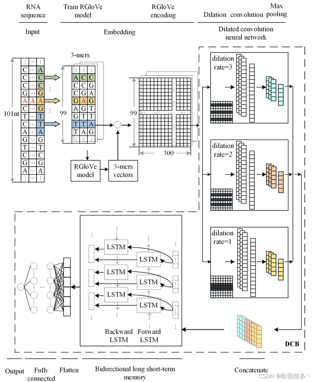 本研究将DCB模型与RNA词嵌入、一热编码和RGloVe三种编码方法相结合,构建了三种修饰位点预测因子。考虑RGloVe预测器,如图7所示。