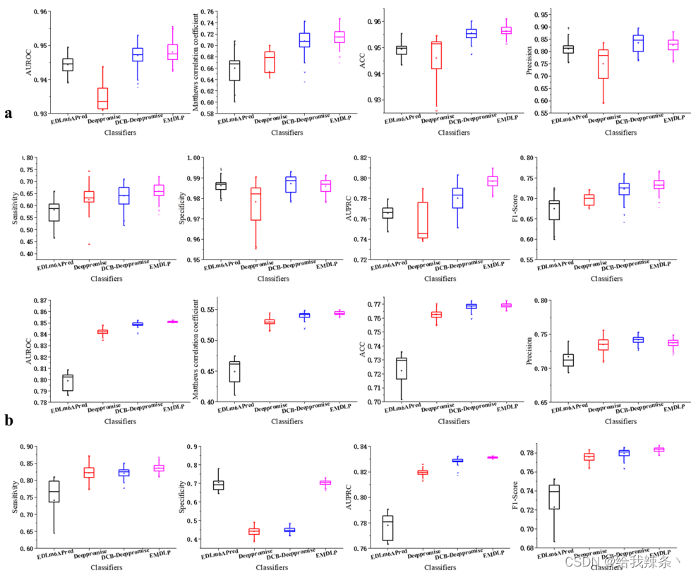 图5:基于四种方法100次重复的paperformance对四种方法的比较性能评估的8个指标的箱线图。a表示m1A独立的数据集。b表示m6A独立数据集