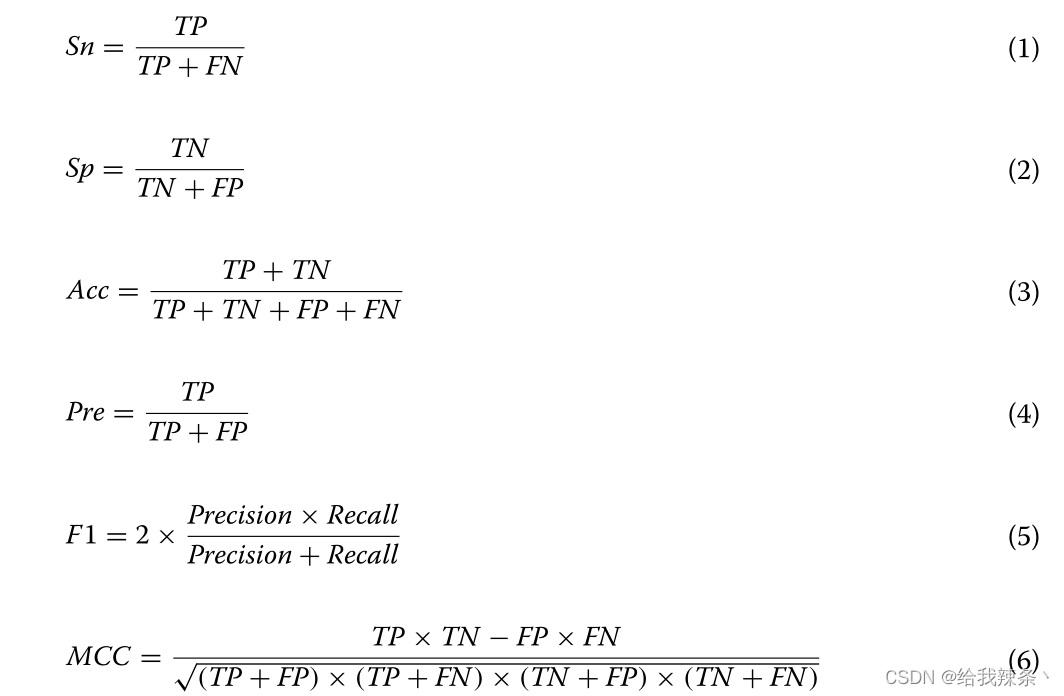 为了估计模型的预测,我们采用了广泛使用的二元分类器评价指标,包括Sensitivity(Sn, Recall)、Specificity(Sp)、Accuracy(Acc)、Precision(Pre)、F1 score (F1)、Matthews correlation coefficient(MCC)、Area under the receiver operating characteristic(AUROC)和Area under the Precision - Recall curve (AUPRC)。Sn、Sp、Acc、Pre、F1、MCC的定义如下: