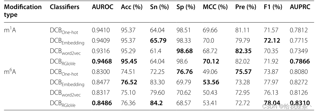 表3:基于One-hot编码、RNA词嵌入、Word2vec和RGloVe的DCB模型评价结果