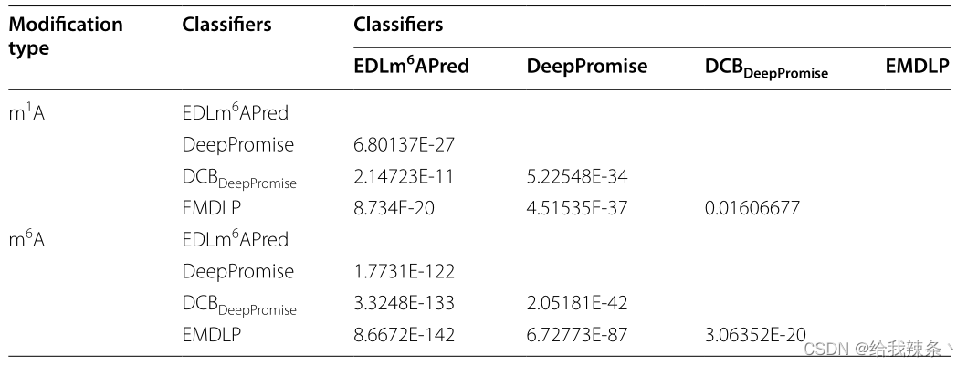最后,在相同的独立数据集上,将EMDLP与其他最先进的方法进行了比较,如DeepPromise[12]和EDLm6Apred[16]。为了使比较更加说明问题,我们用DCB替换了DCBDeepPromise中的CNN模型来构建DCBDeepPromise,我们的EMDLP用RGloVe替换了DCBDeepPromise中的ENAC编码。