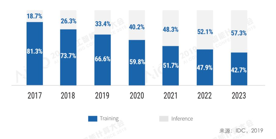 在《2019-2020中国人工智能计算力发展评估报告》中 [5],调查机构IDC有报告指出,推理相对于训练的比重会逐年上升,预计到2022年会超过训练。如下图所示。
