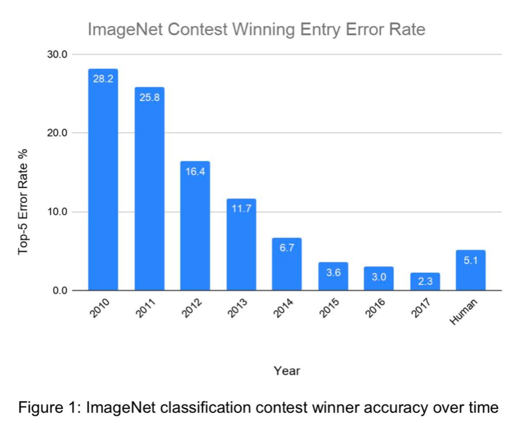 CV中的ImageNet Challenge在2015年进入到了一个特别的时刻:机器学习模型的准确率正式超过了人类 (ResNet的Top-5 Error Rate是3.6%,而人类的Top-5 Error Rate是5.1%) 见下图。