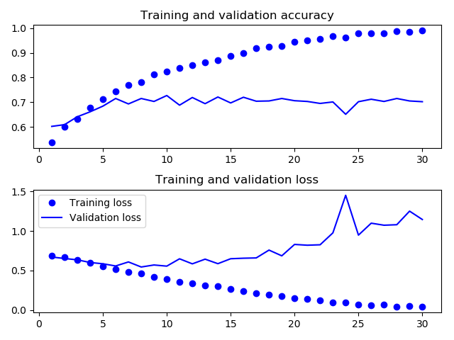 #训练精度随着时间线性增加,直到接近 100%,而验 证精度则停留在 70%~72%。验证损失仅在 5 轮后就达到最小值,然后保持不变,而训练损失则 一直线性下降,直到接近于 0