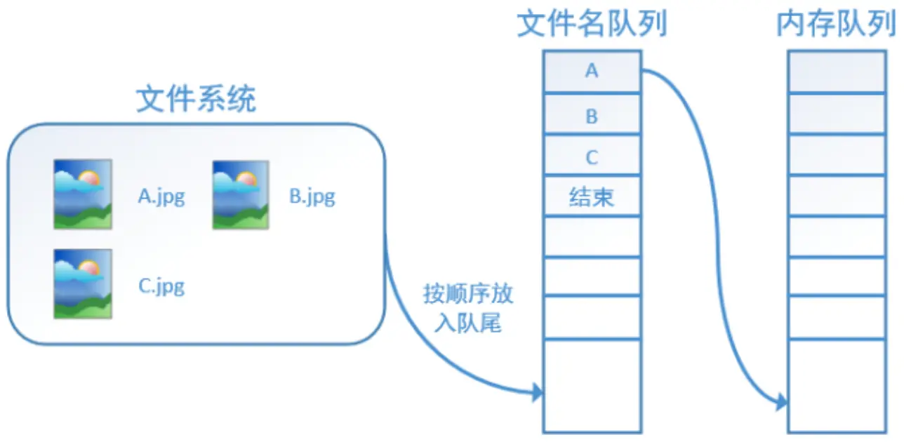 - 内存队列,这个队列不需要用户手动创建,有了文件名队列后,start_queue_runners之后,Tensorflow会自己维护内存队列并保证用户时时有数据可读。