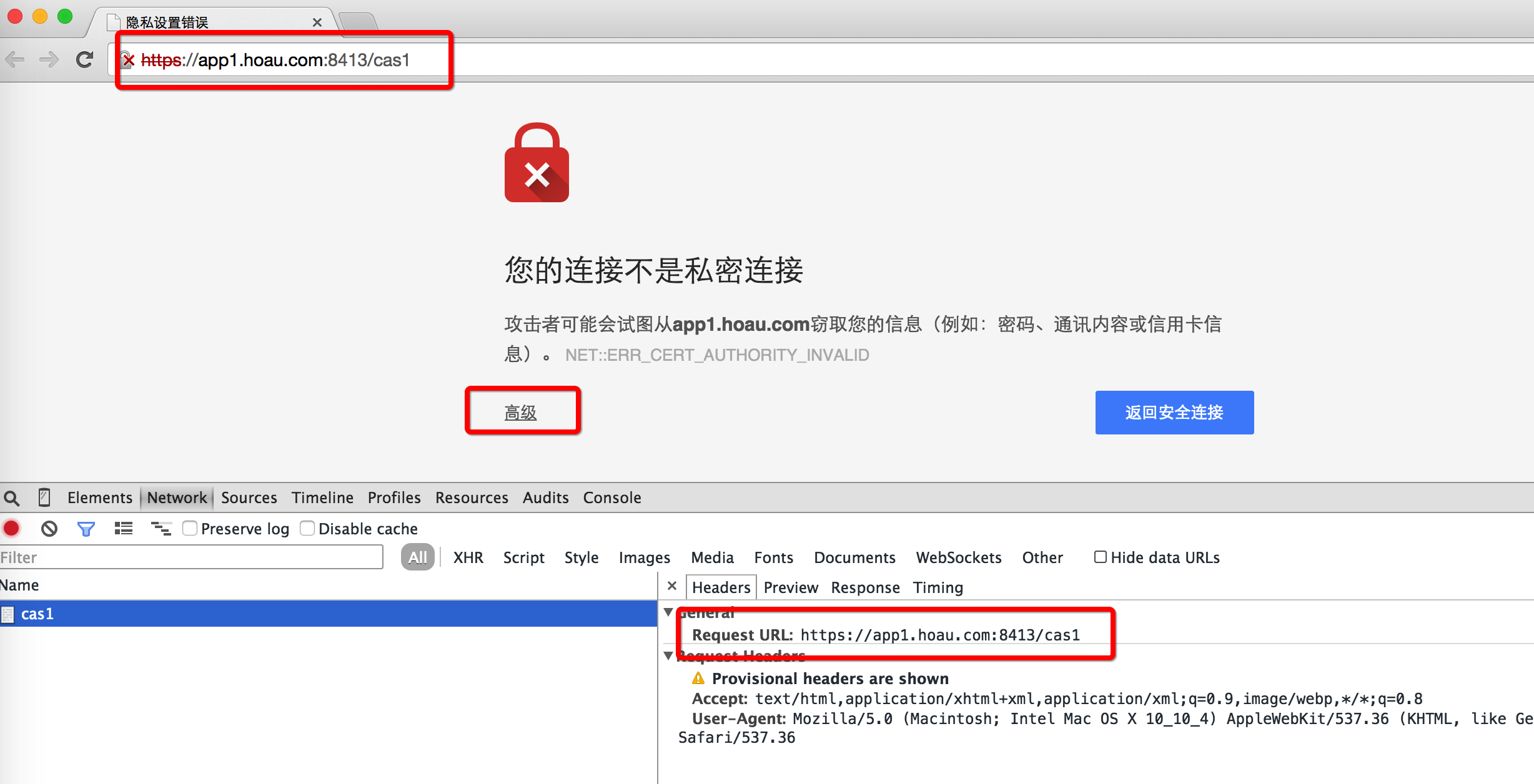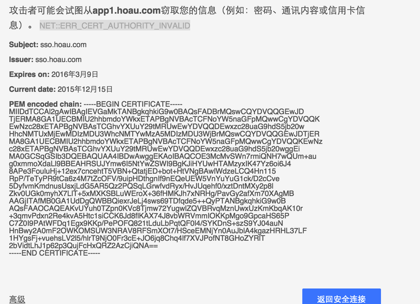 点击“高级”,选择“继续前往app1.hoau.com(不安全)”