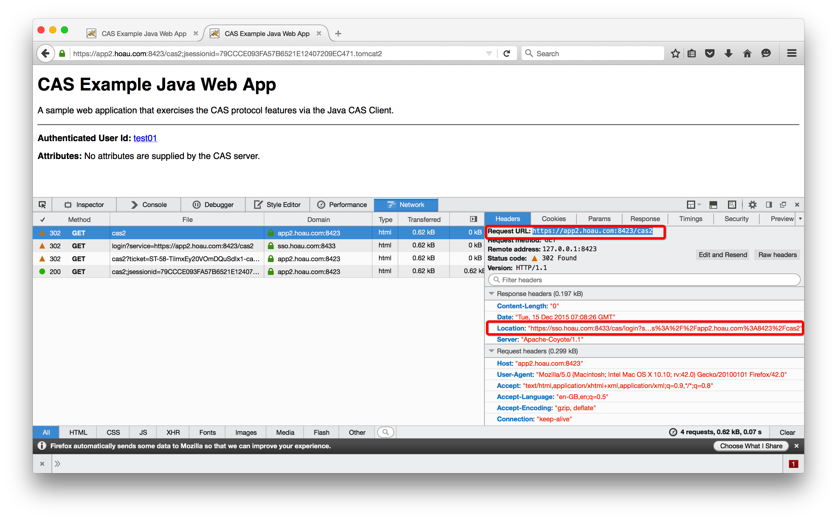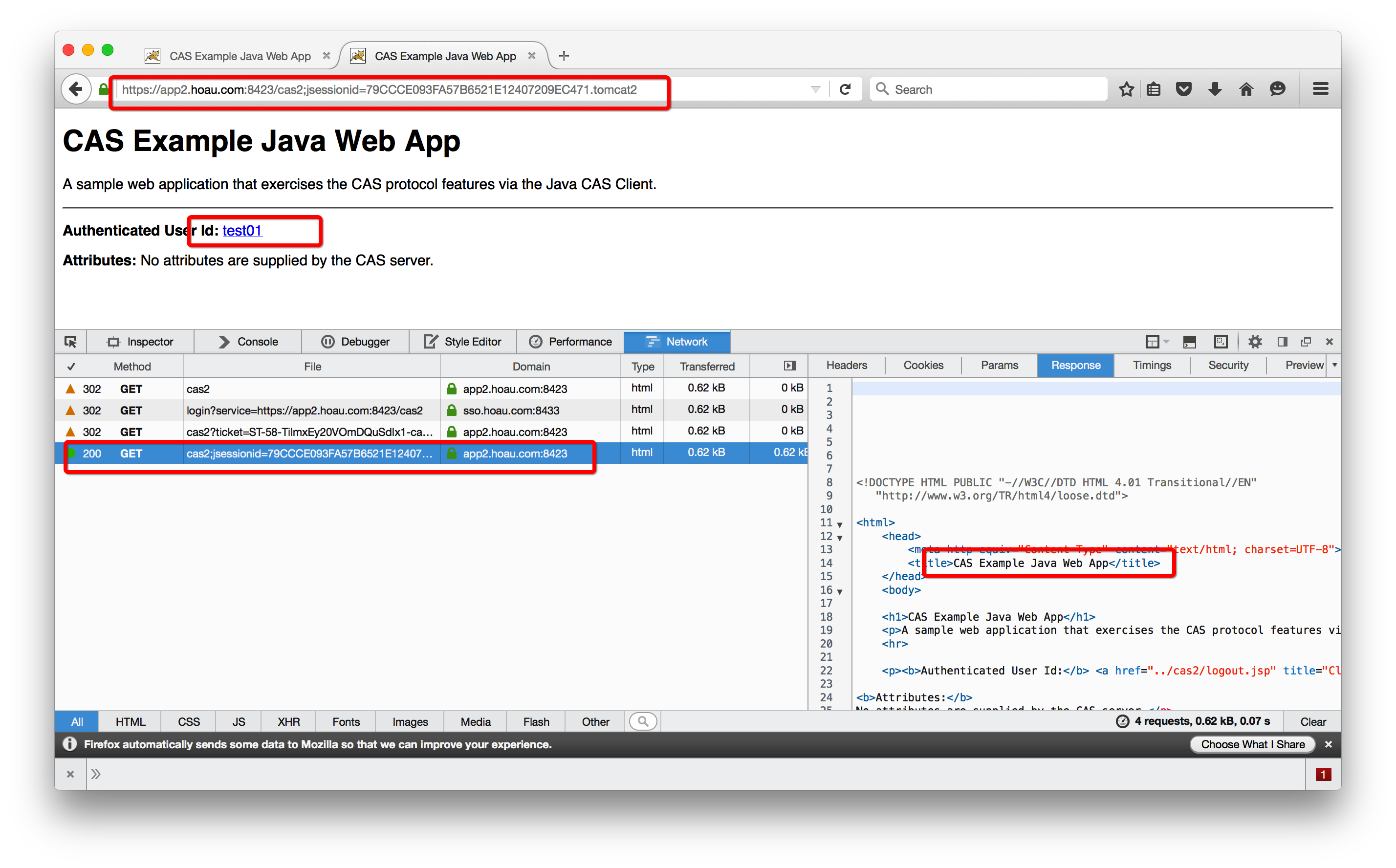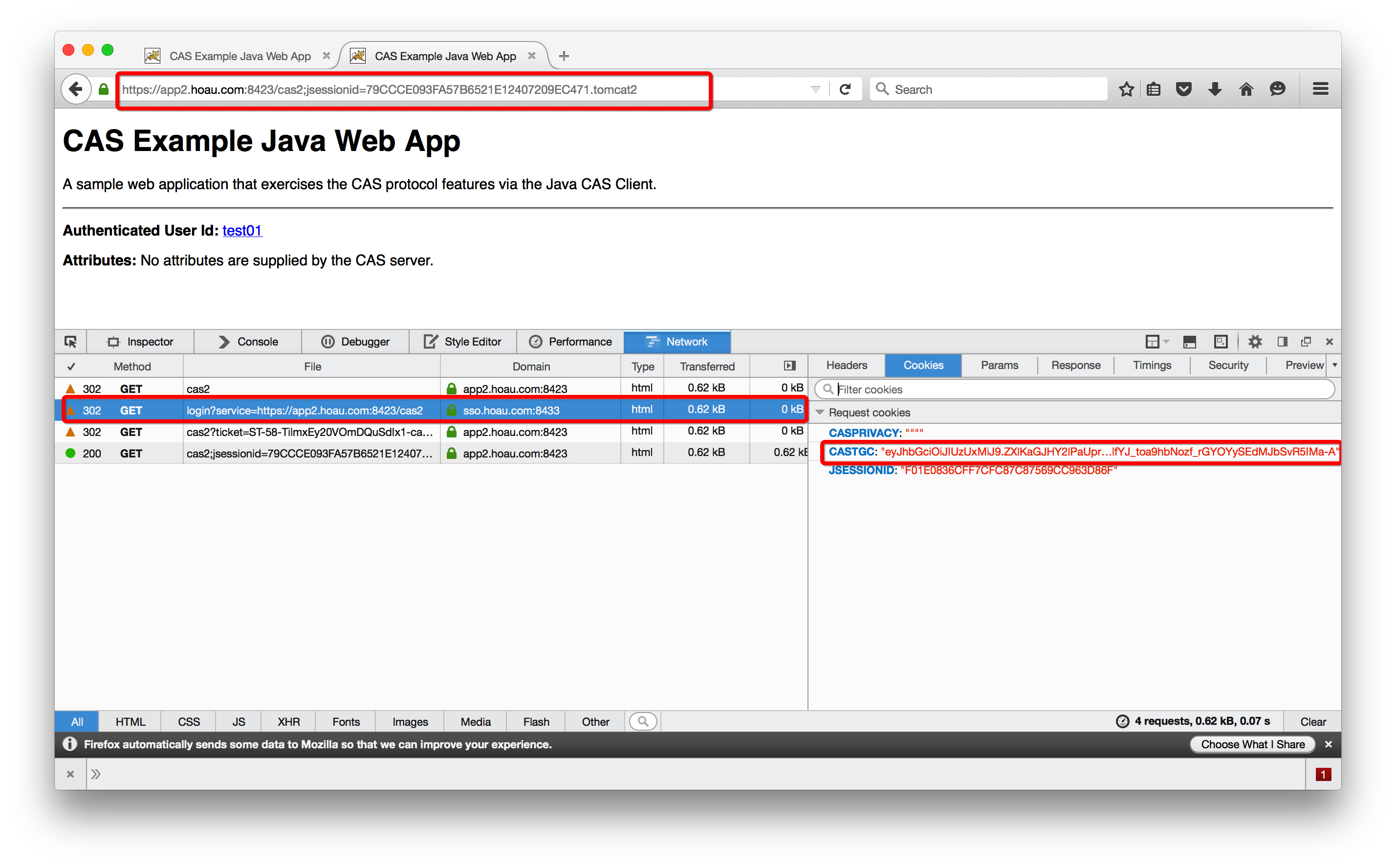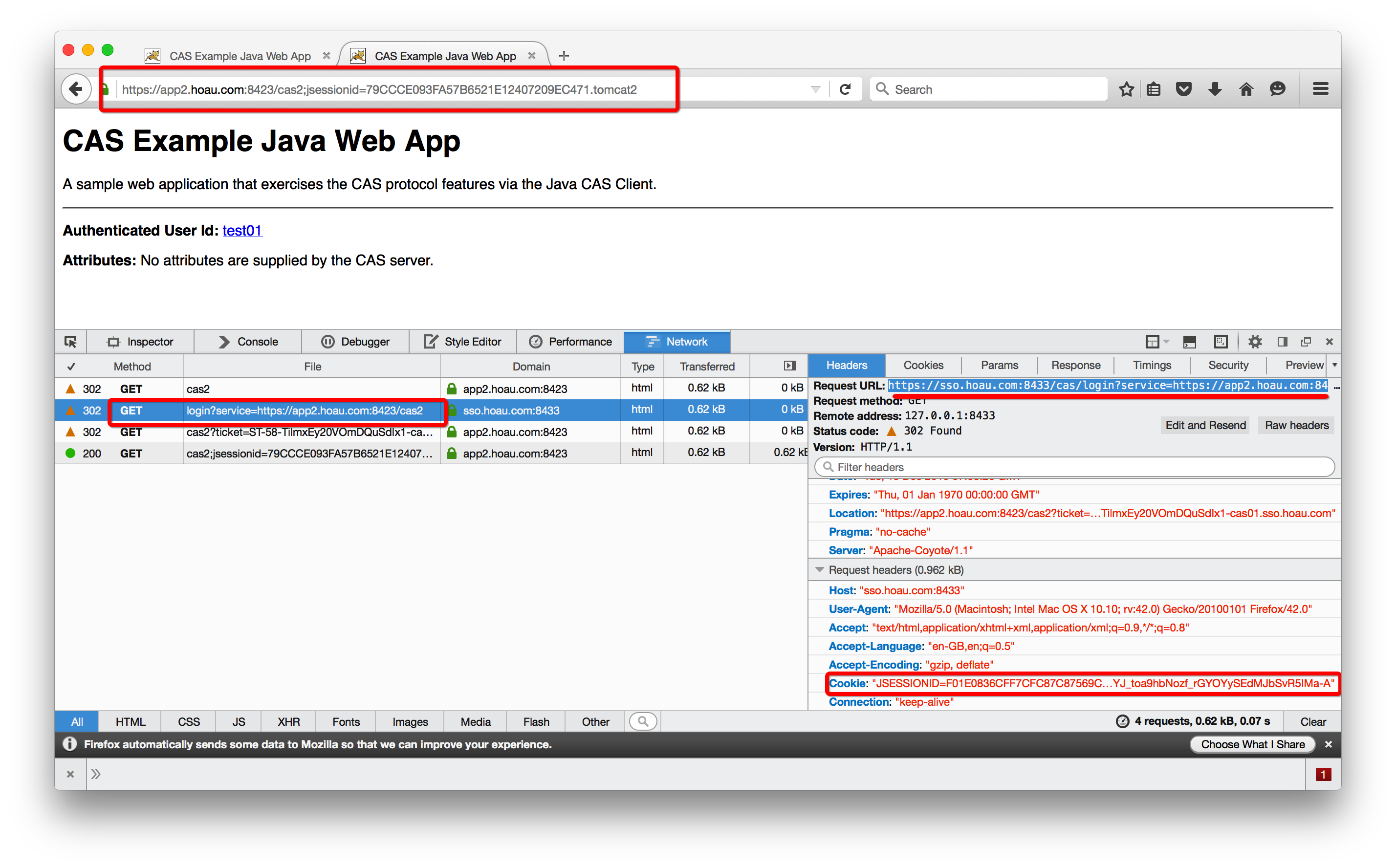 通过“302 Found”将浏览器重定向到Protected App的目标页面,同时设置Cookie的JSESSIONID