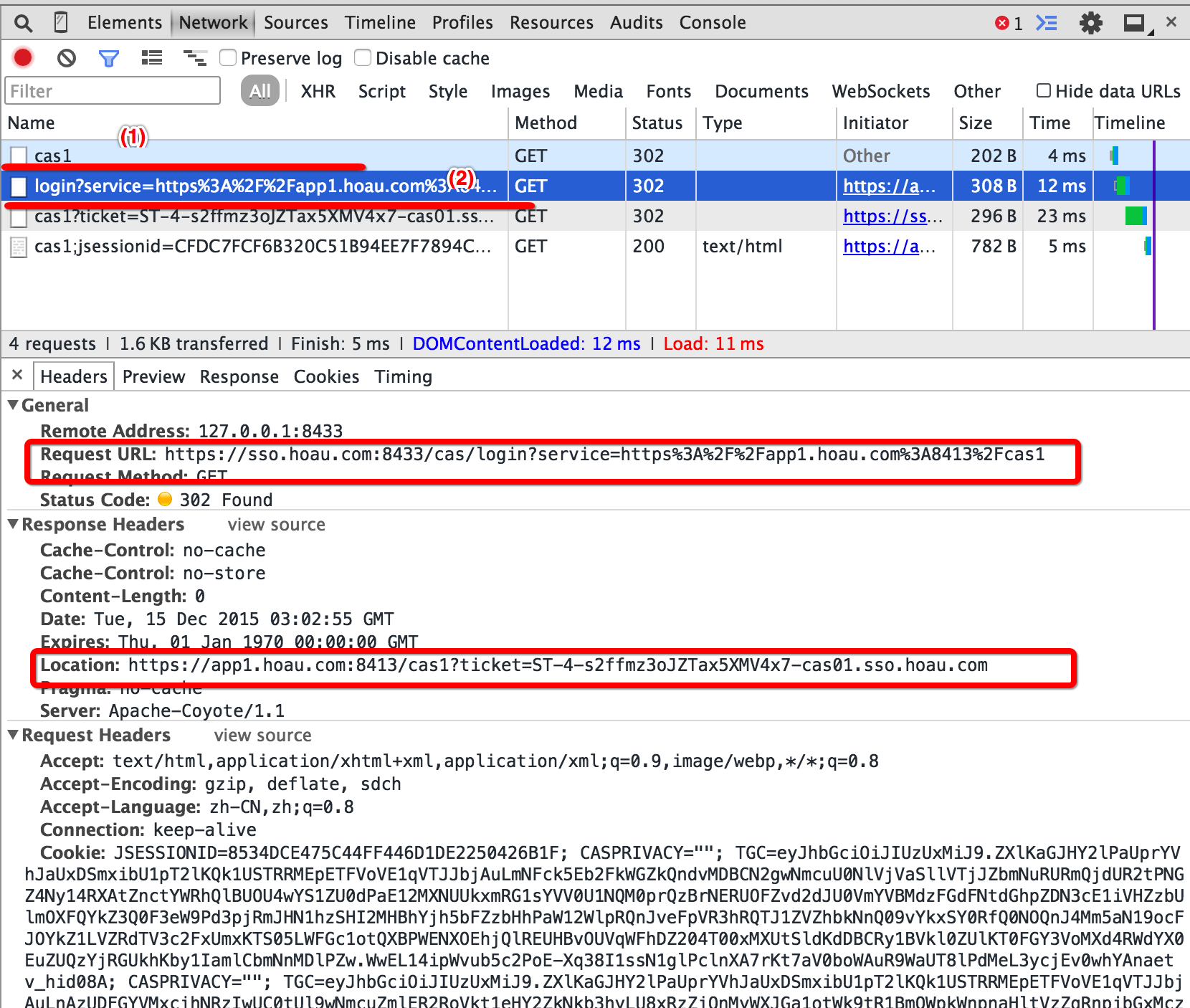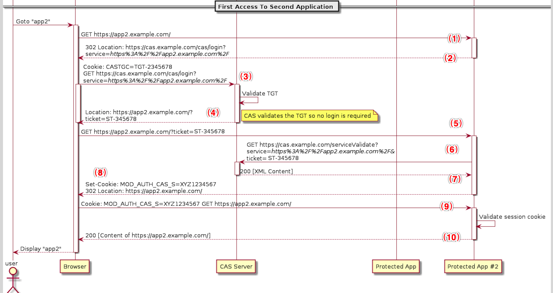 可以看到下图中Protected App在(1)时又将浏览器重定向了CAS服务器,并且又为客户端生成了新的Ticket