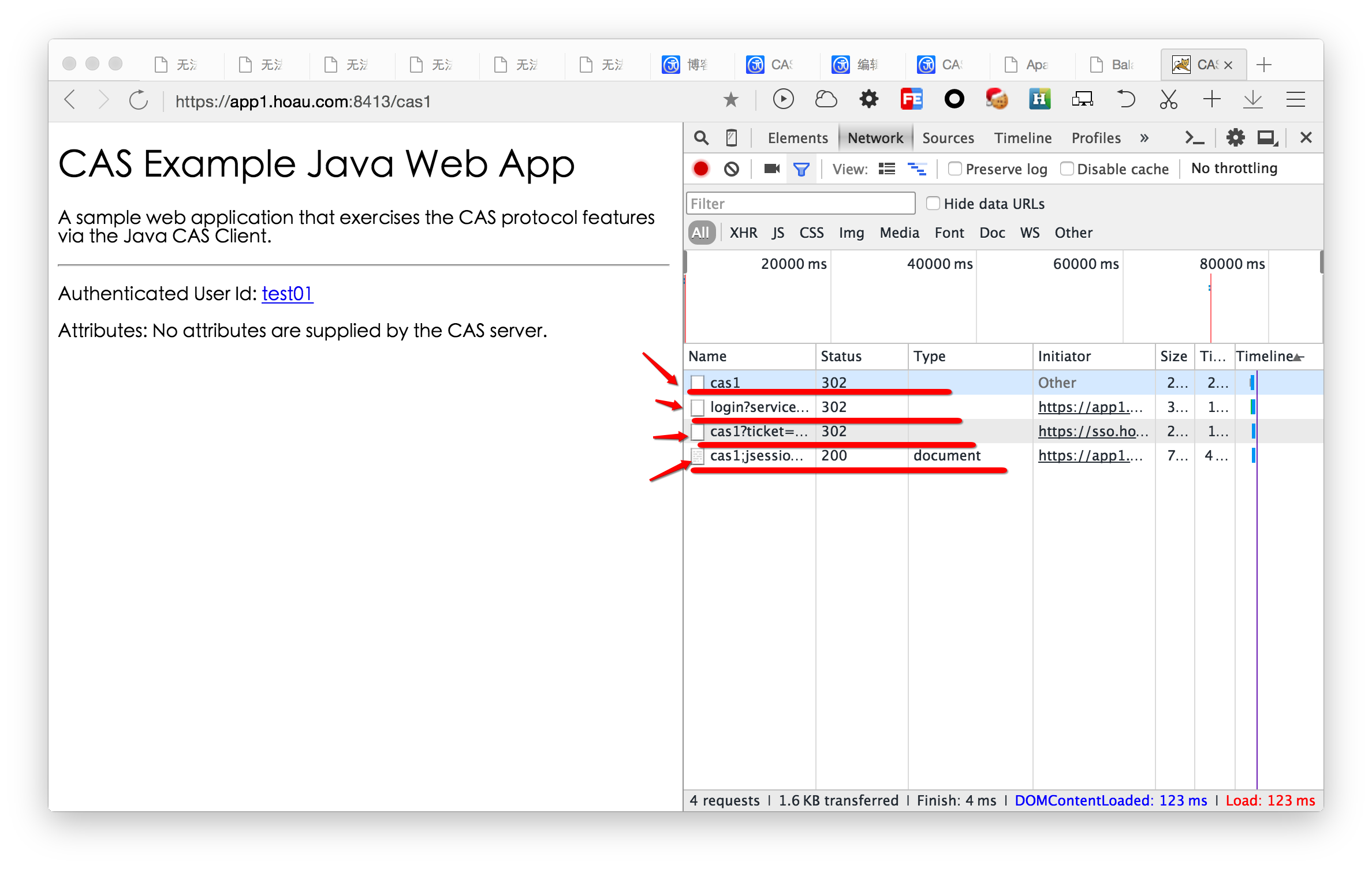 发现经过上面4段请求验证后,浏览器url上会带上jsessionid,如果将此请求参数删除,那么会重新经过4段请求。