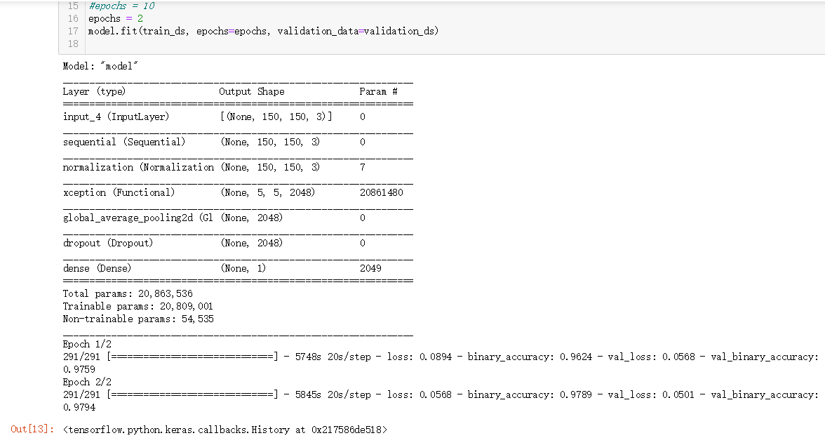 我们加载在 ImageNet 上预训练的 Xception 模型,并将其用于 Kaggle Dogs vs. Cats 分类数据集:(我的环境为最新版tensorflow2.4)