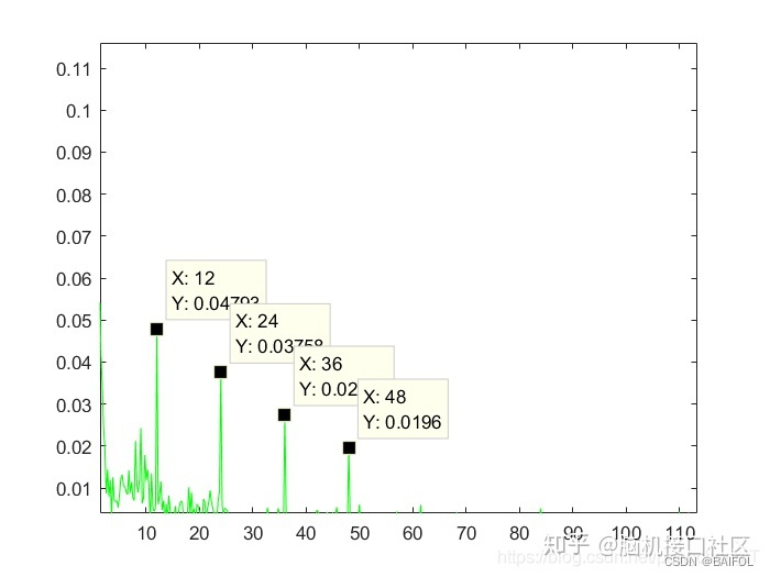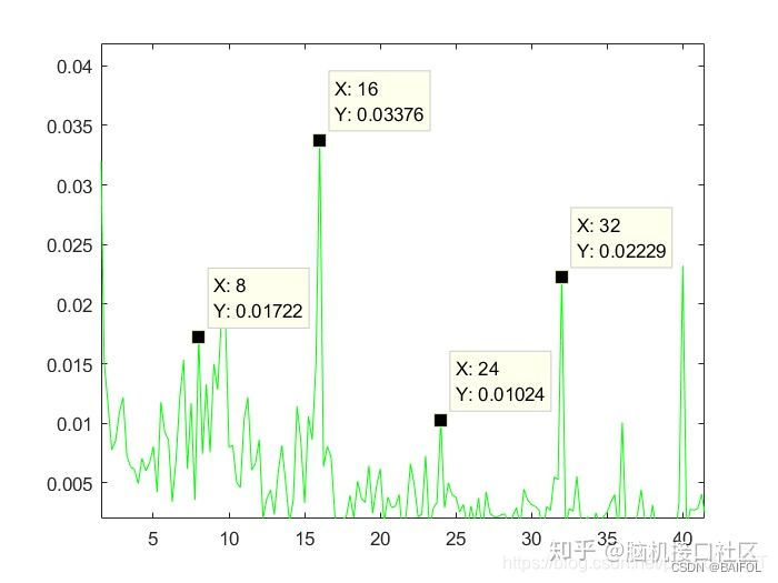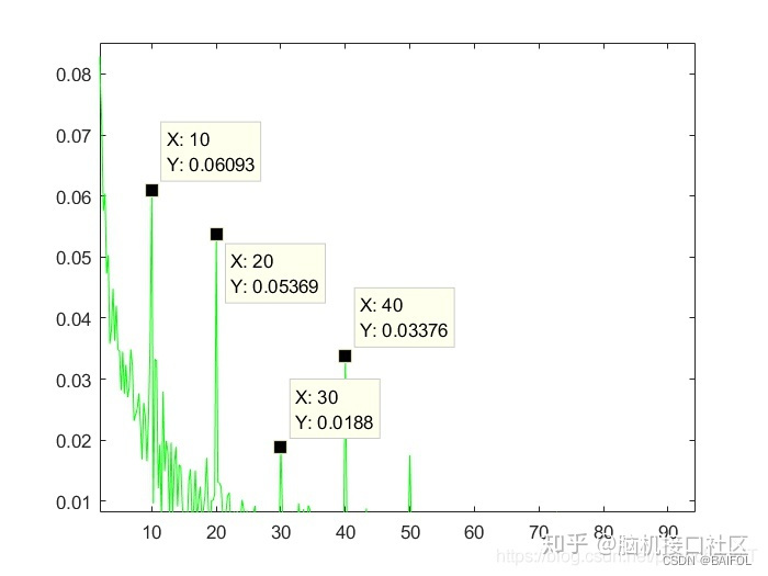 通过对脑电波的频域分析,观察其频率与其谐波频率,可以得出这6个刺激频率分别是7,8,9,10,11,12Hz