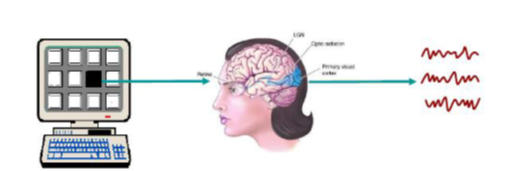 稳态视觉诱发电位(steady-state visual evoked potentials,SSVEP)是BCI系统经常使用的一种信号,它当人眼受到固定频率超过4Hz的视觉刺激时,大脑皮质活动将被调节,导致类似于刺激的周期性节律。