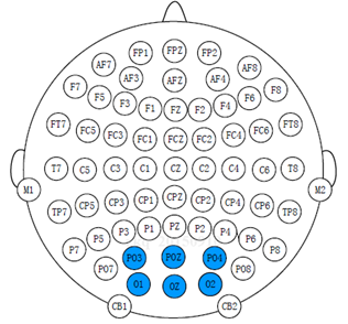 外界的光线进入人眼后,视细胞层利用自身的感光作用,将光能转化为神经电位信号,然后传输至大脑皮层形成视觉诱发电位,进而可以利用BCI 系统采集并分析SSVEP 信号,在大脑皮层中与枕叶视觉区有关的脑电通道主要有六个,如下图所示。