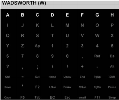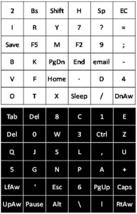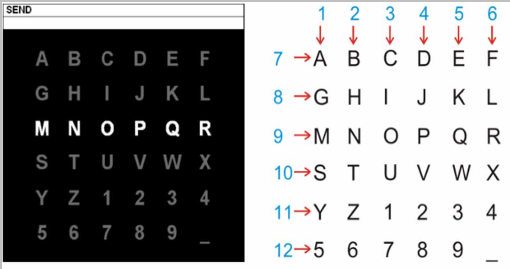P300 Speller 打字界面(左图为一行高亮的界面图 右图为打字界面的行列编号),