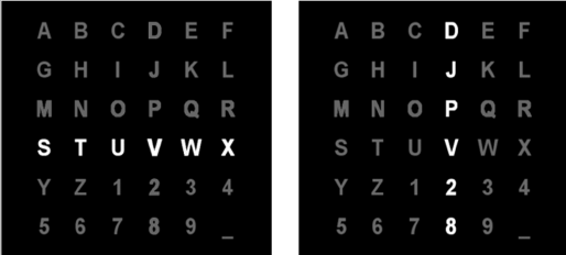 字符"V"的行和列高亮 图片来源于:基于P300的脑机接口指令识别 图2.5
