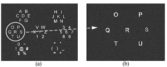 这个范例的思想原理是让几个区域闪烁,而不是使用行和列。字符识别是在两个层次上进行的。在第一个层次,字符被放置在屏幕的不同部分的七个组,如下图所示。在Farwell-Donchin范例中,当一组字符随机增强时,用户被要求关注组中的特定字符。通过对P300的检测,经过多次增强后,可以发现包含目标字符的组。在第二层,被检测组的特征被分布到另外七个区域。例如,下图显示了在第二层中展开的一个区域。在第二层,与第一层所做的工作类似,不同的区域被强化,而受试者集中在其中一个区域。在对其中一个区域的P300进行检测之后,就可以识别出最终的目标字符。