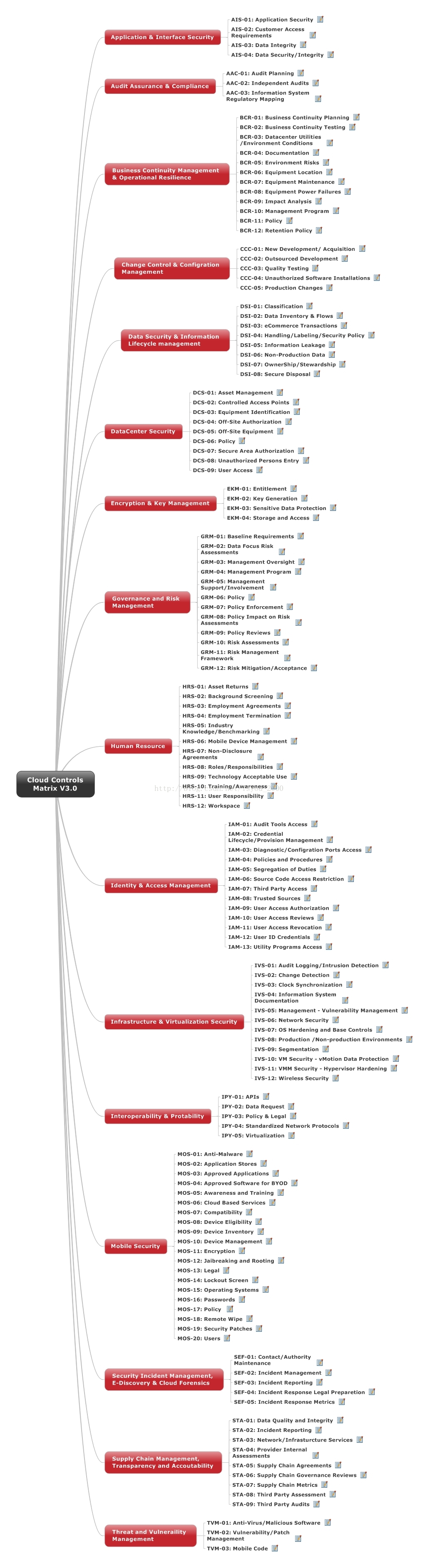 云安全联盟(CSA)近期正式发布CSA云控制矩阵(CCM)3.0版,该版本共包括16个控制域,136个控制点。其组成如下图: