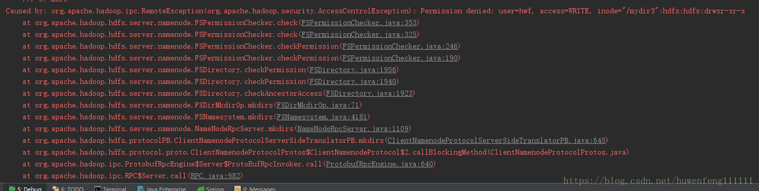 Caused by: org.apache.hadoop.ipc.RemoteException(org.apache.hadoop.security.AccessControlException): Permission denied: user=hwf, access=WRITE, inode="/mydir3":hdfs:hdfs:drwxr-xr-x