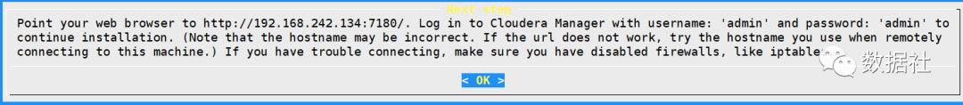 安装完成后提示如下说明cm安装成功,启动7180端口,用户名和密码都是admin;
