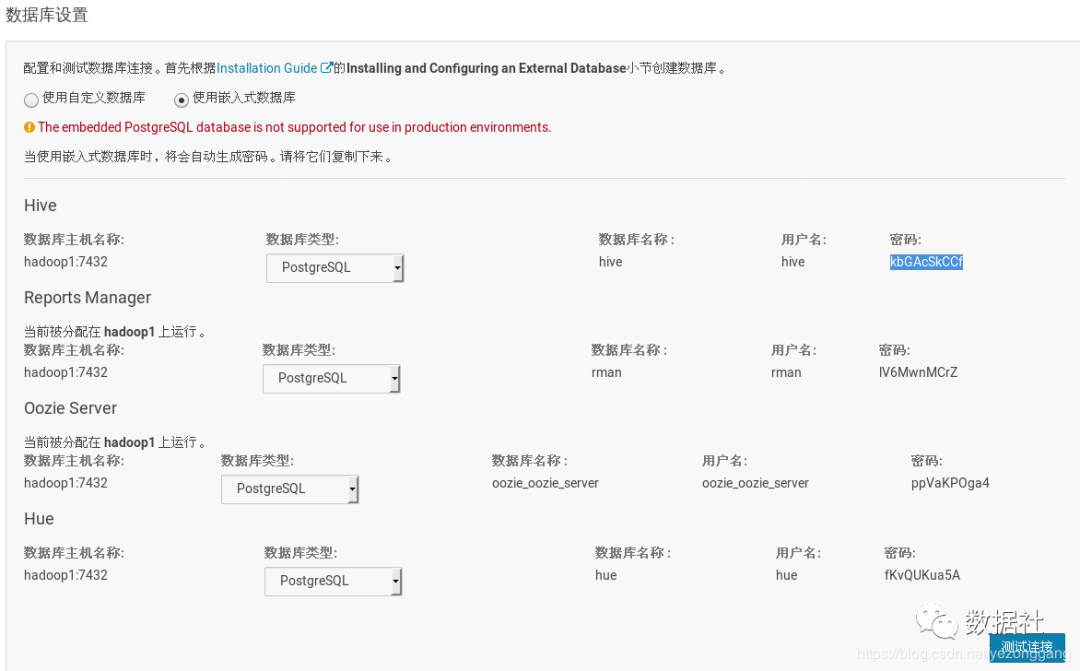 这里使用默认的pgsql作为元数据库,可以自己安装mysql库,并将其作为元数据库;