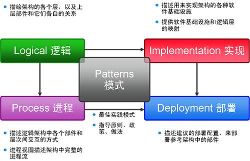 由于在规划服务基础设施参考架构时,需要涵盖几类 SOA 参与者和干系人 (stakeholders) 各自不同的顾虑,包括架构师、程序员、和负责部署、运营、监控的 IT 人员,我们可以采用一个针对服务基础设施参考架构调整过的 4+1 视图(如下),来协助我们分离顾虑,来将不同层面的规范和目标架构一一制定,通过逻辑、实现、部署,和进程等四个视图,配合最佳实践典范和模式,来对参考 架构的各个层面,进行描述和规范,如附图。