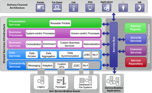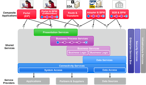 高效的 SOA 需要采用新的方法来对待 IT 基础设施,并且根据个别企业的需求来量身定做,并将服务基础架构、共享的技术服务、安全服务,以及信息/数据、和遗留系统访问服务等,全部定义在内。