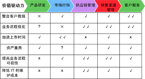 针对各价值驱动力,我们可以参考附图中的矩阵分析方式,从价值链或业务线中的各个主要的职能(纵向),和各个识别出来的业务和 IT 驱动力(横向),对 SOA 所可能产生的正面影响力,一一进行评估,进而挑选出面向服务解决方案最能嘉惠的业务能力,作为首期实施 SOA 项目的切入点。图中的范例只是一个三万尺高空的起点,在真实的情况下,往往会针对范例中某个或某几个得分较高的业务线,往下展开细化,对该业务线中的各个 主要业务能力,进一步进行 SOA 价值驱动力分析;换句话说,价值链分析中的各个职能域,应该自粗到细,逐步钻取、drill down 到适当的深度,才能更精准地确定 SOA 能对哪些要迫切改善的业务能力,带来最大价值。