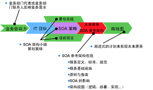 为了满足 SOA 的要求,所有公司都需要 SOA 参考架构和路线图,来指导部署一套能随时间演进、而逐渐丰富的工业级服务基础设施,同时指导对面向服务应用的开发和管理。