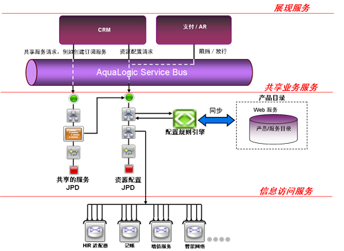 图说: 服务基础设施参考架构的实现视图实例(场景为某电信客户的 provisioning service),描绘所计划采用的产品,以及如何通过这些产品间的交互,来实现解决方案