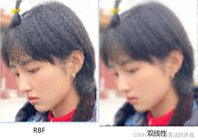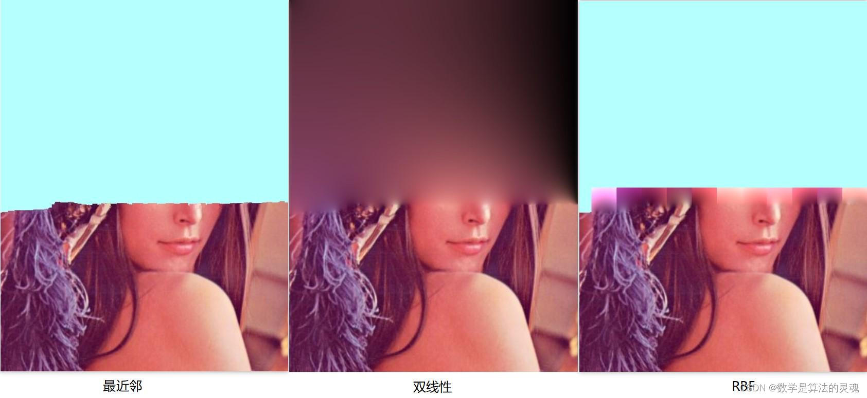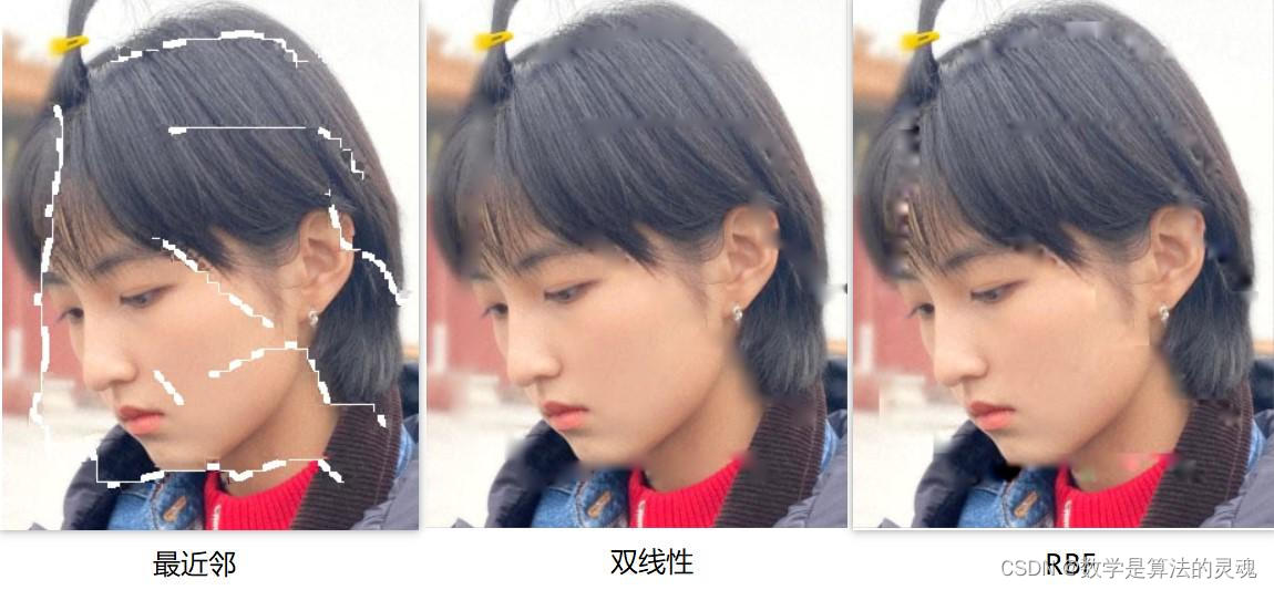 最近邻算法(中间)的结果变的模糊,并且有些走样,出现了原图中没有的结构双线性插值(左边)也有些模糊,但是看起来像是做过滤波平滑一样,但人脸结构都是正常的