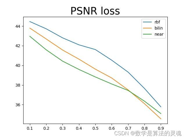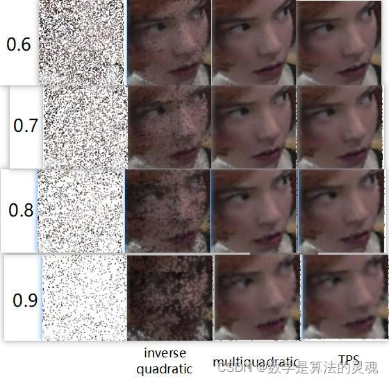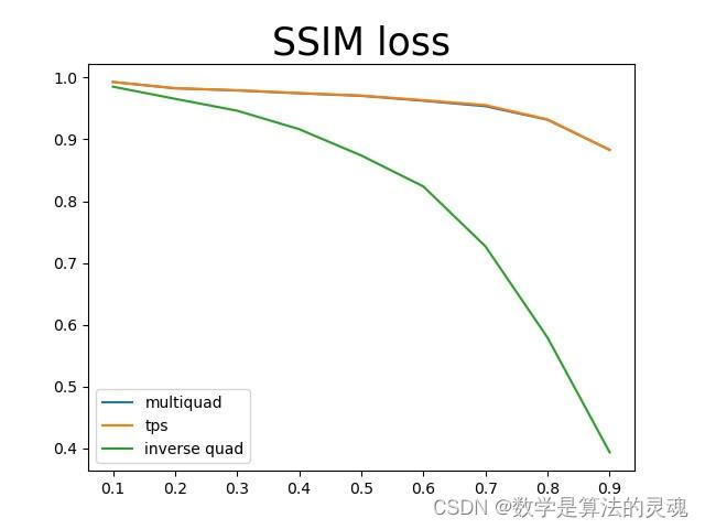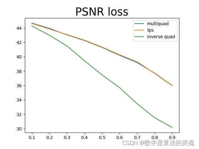 仍然是使用上面测试的那张图片,三种基函数中multiquadric和TPS的结果几乎是一模一样的,三个指标的曲线都是重合的,inverse quadric函数的结果要比另外两个差很多。