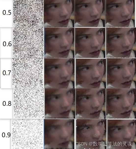 从上图的变化中可以看出在丢失率比较小的时候,三种算法并没有什么肉眼可见的差异,几乎都和原图相同。但是随着丢失率的上升,三种算法差异比较明显: