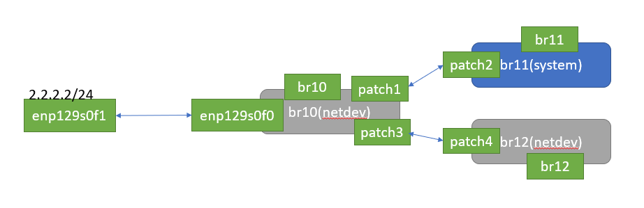 root@ubuntu:~# ovs-vsctl add-port br10 patch1 -- set interface patch1 type=patch options:peer=patch2 -- add-port br11 patch2 -- set interface patch2 type=patch options:peer=patch1