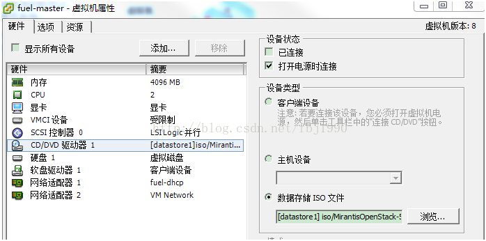1、创建fuel-master虚拟机,设置从光盘启动,选择fuel-dhcp和VM Network网卡,加载Fuel 5.1镜像: