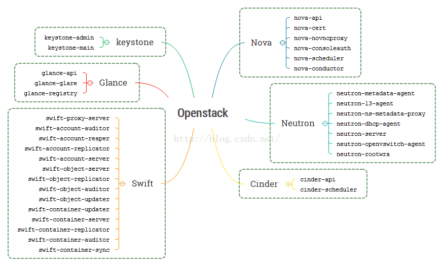 Openstack可以看作是一系列服务(各个子项目)每个服务对外提供API/CLI,,对内则是有一系列进程组成。在官方文档中描述的进程很多,但实际上未必都是必须的,因此把初始安装环境中的进程查出来,从这些来入手了解。