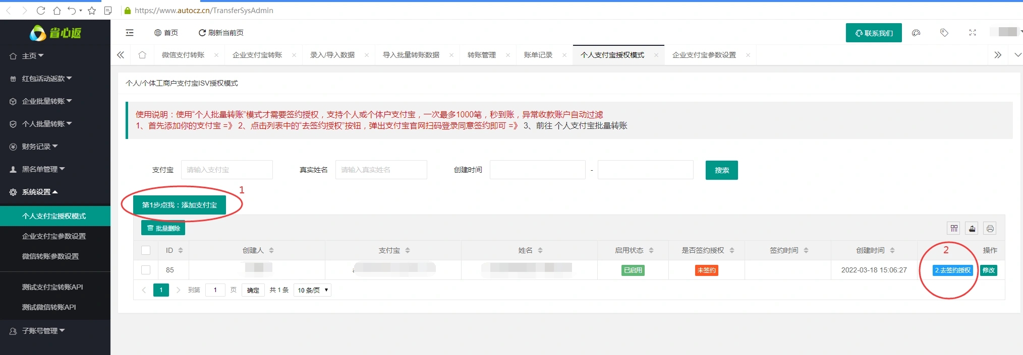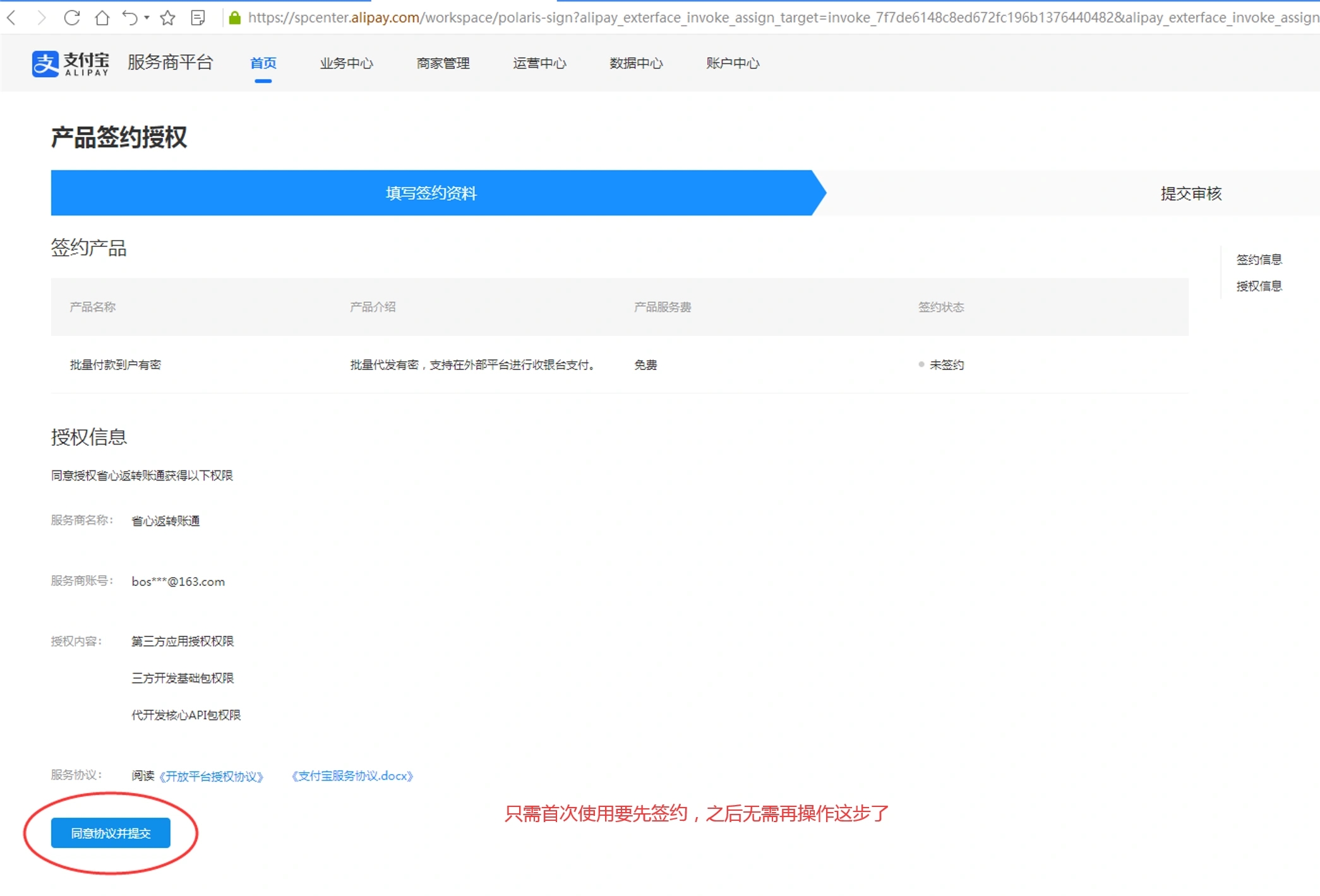 首次使用需要先添加你的支付宝(个人和企业都通用支持),再点击列表中的 去签约授权 按钮跳转到支付宝官网,登录后,点击同意协议提交即可。