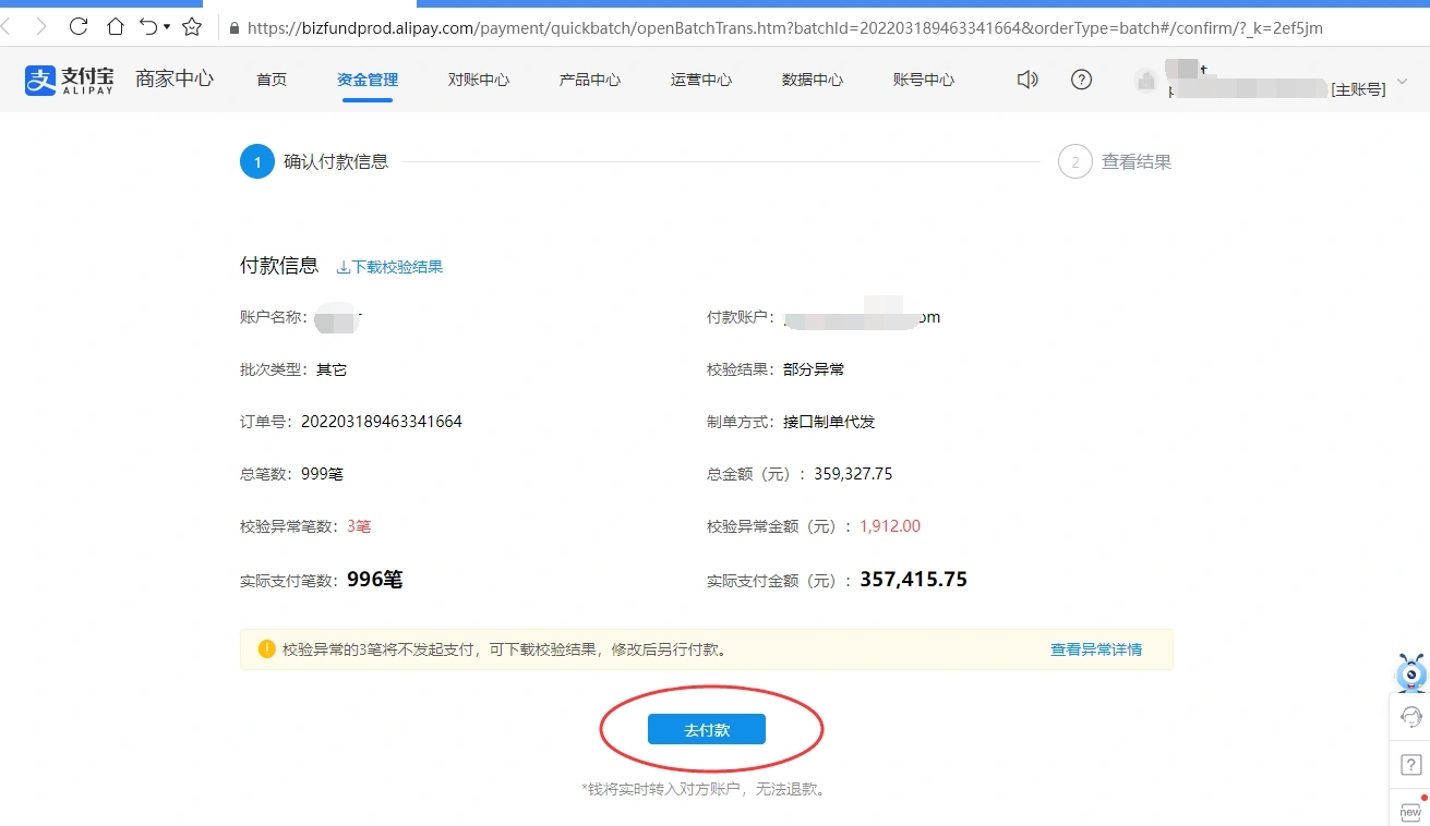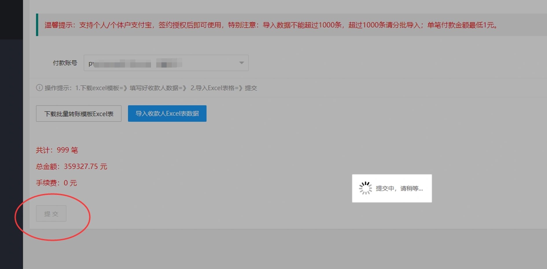 导入收款人数据,确认笔数和金额无误,点击 提交 按钮后,如下图: