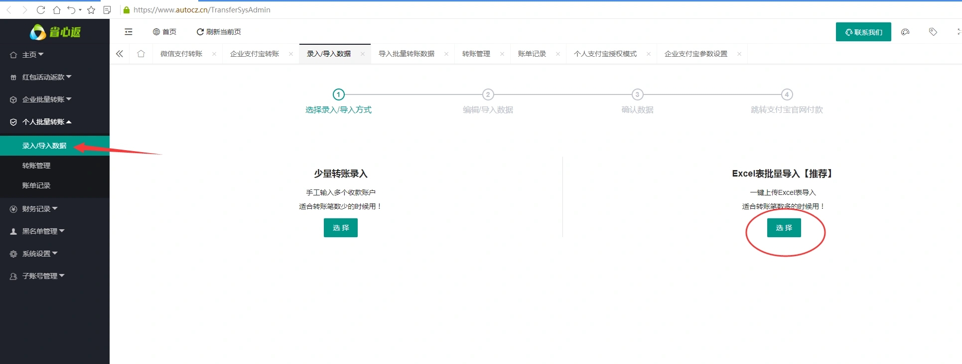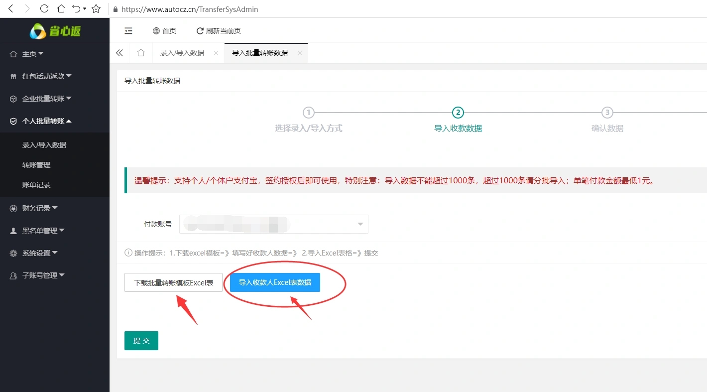 开始付款,到左边菜单点击 录入/导入数据, 进去选第二个,Excel表批量导入模式。(如果少量也可以选第一个手工录入)