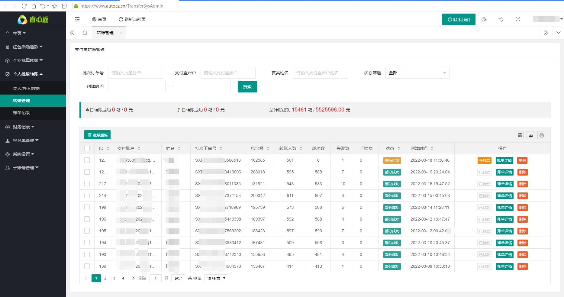 付款成功后,关闭窗口即可,再回到省心返网站左边菜单点击“转账管理”就可以看到刚才订单数据了,如下图: