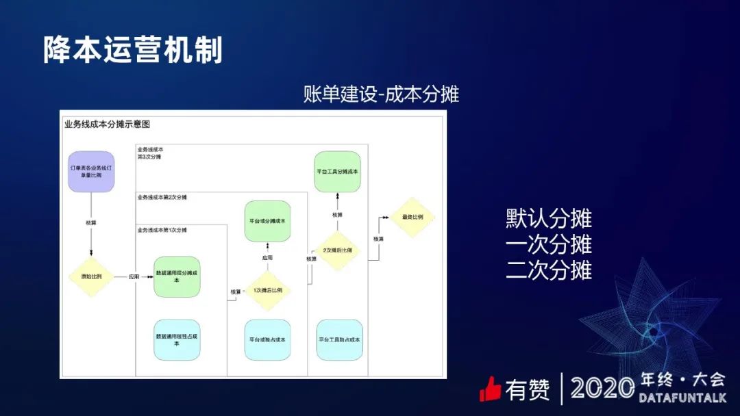 上图是分摊业务线的大致逻辑,底层是数据、任务和平台服务。成本有两类,独占成本和分摊成本。独占成本就是有些集群平台或者任务就是为某个业务服务的,这些成本全部归到业务。分摊成本,比如说数仓中间层,它的订单交易或者店铺可能有很多业务线都用到了,数仓去建立这些能力需要的成本,就需要分摊到这些业务线。
