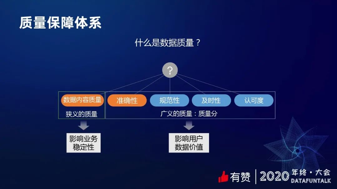 说到数据质量,大家最先涌到脑海的可能是数据内容质量。也就是说,怎么去保证数据内容的准确性,这是比较狭义的质量。质量其实还包括很多方面,比如说准确性、规范性、及时性和认可度,称为广义的质量。我们为广义的质量去做了一个产品,叫质量分。狭义的质量会影响业务的稳定性,比如说哪个数据出错了,比如说商家的GMV肯定是不能出错的,出错了会影响业务的稳定。而广义的质量会影响用户,且最终会影响数据价值的挖掘。